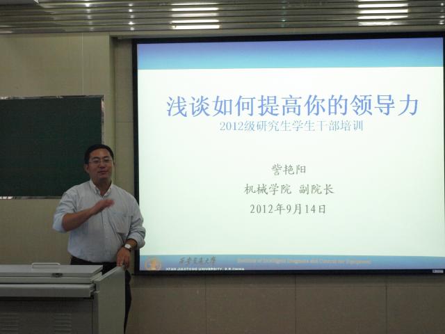 訾艳阳教授深入浅出地为同学们做了题为“如何提高你的领导力”的报告,从对大学的理解与认识,机械学院的教育管理理念与措施,新一代研究生的特点与问题,对班干部的定位与理解以及什么是领导力等五个方面为新生干部做了精彩的报告。其中,他特别强调了“干部”二字的含义,并希望大家多思考多实践,培养自己出色的组织领导能力。
