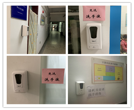 2、进入实验中心的所有入口都设有无接触的免洗消毒洗手液,保证进入中心的每个学生都能用上消毒洗手液。