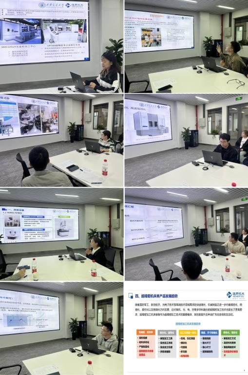 七位硕博士生及通用技术集团机床工程研究院工程师马昂扬就参观第十三届中国数控机床展的收获和体会作主题汇报。侯桂金同学作题为“智能制造、互联互通”的报告,她主要关注数控机床的高端化、智能化与绿色化,分享了GMC125u/t五坐标加工中心、UPT350超精密单点金刚石车床等数控机床的特点。皇甫宁宁同学聚焦机床整体及零部件在动力学方面的进展,与自身课题内容结合,对机床阻尼机构及减震方案进行了总结。谢天同学侧重探讨了测量设备及方法,归类列举了各类影像测量仪器、检测单元的实际应用。其他几名同学也分别基于展会产品,从多角度进行分析总结,提出个人感悟,内容丰富,思维活跃。马昂扬就超精密机床类重点装备的调研进行了线上汇报,分享了五轴高速磨削中心、Microtech系列精密硬车削机床等国产超精密机床装备,列举了具有代表性的高速电主轴、监测测量装备等的关键技术参数,同时总结了超精密机床类产品的发展趋势。