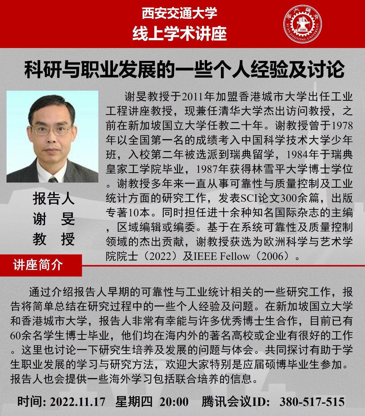谢旻教授于2011年加盟香港城市大学出任工业工程讲座教授,现兼任清华大学杰出访问教授,之前在新加坡国立大学任教二十年。谢教授曾于1978年以全国第一名的成绩考入中国科学技术大学少年班,入校第二年被选派到瑞典留学,1984年于瑞典皇家工学院毕业,1987年获得林雪平大学博士学位。谢教授多年来一直从事可靠性与质量控制及工业统计方面的研究工作,发表SCI论文300余篇,出版专著10本。同时担任进十余种知名国际杂志的主编,区域编辑或编委。基于在系统可靠性及质量控制领域的杰出贡献,谢教授获选为欧洲科学与艺术学院院士(2022)及IEEE Fellow(2006)。