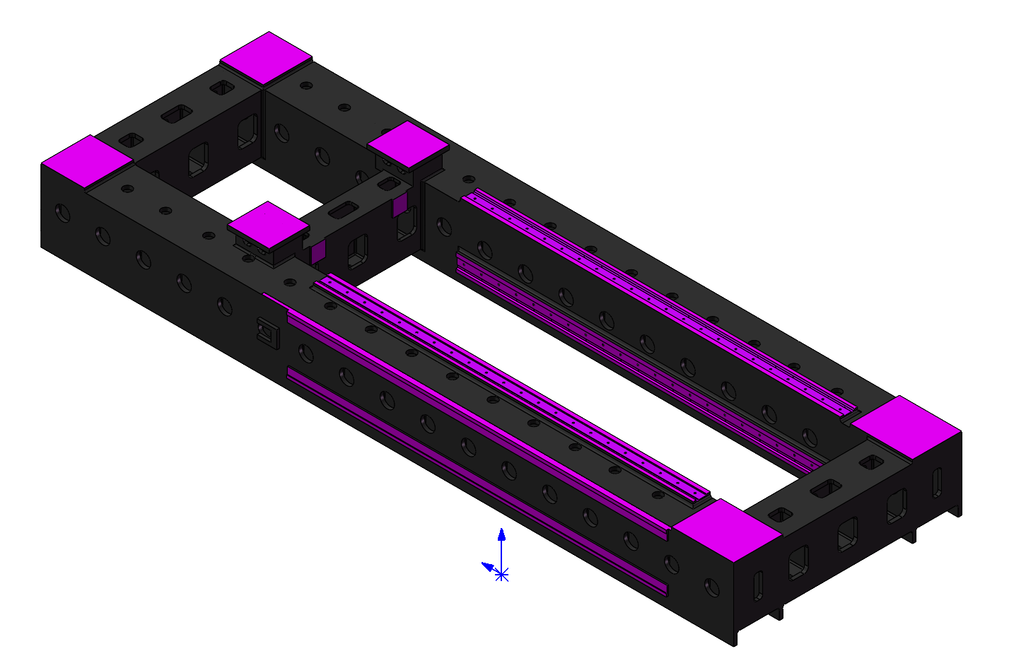 在原有铸件的基础上进行精加工。加工底座、立柱A、立柱B、横梁、Z轴滑块、X轴滑块A、X轴滑块B、共计8件,对加工面进行精加工,并钻孔以满足装配需求。导轨安装面需刮研。