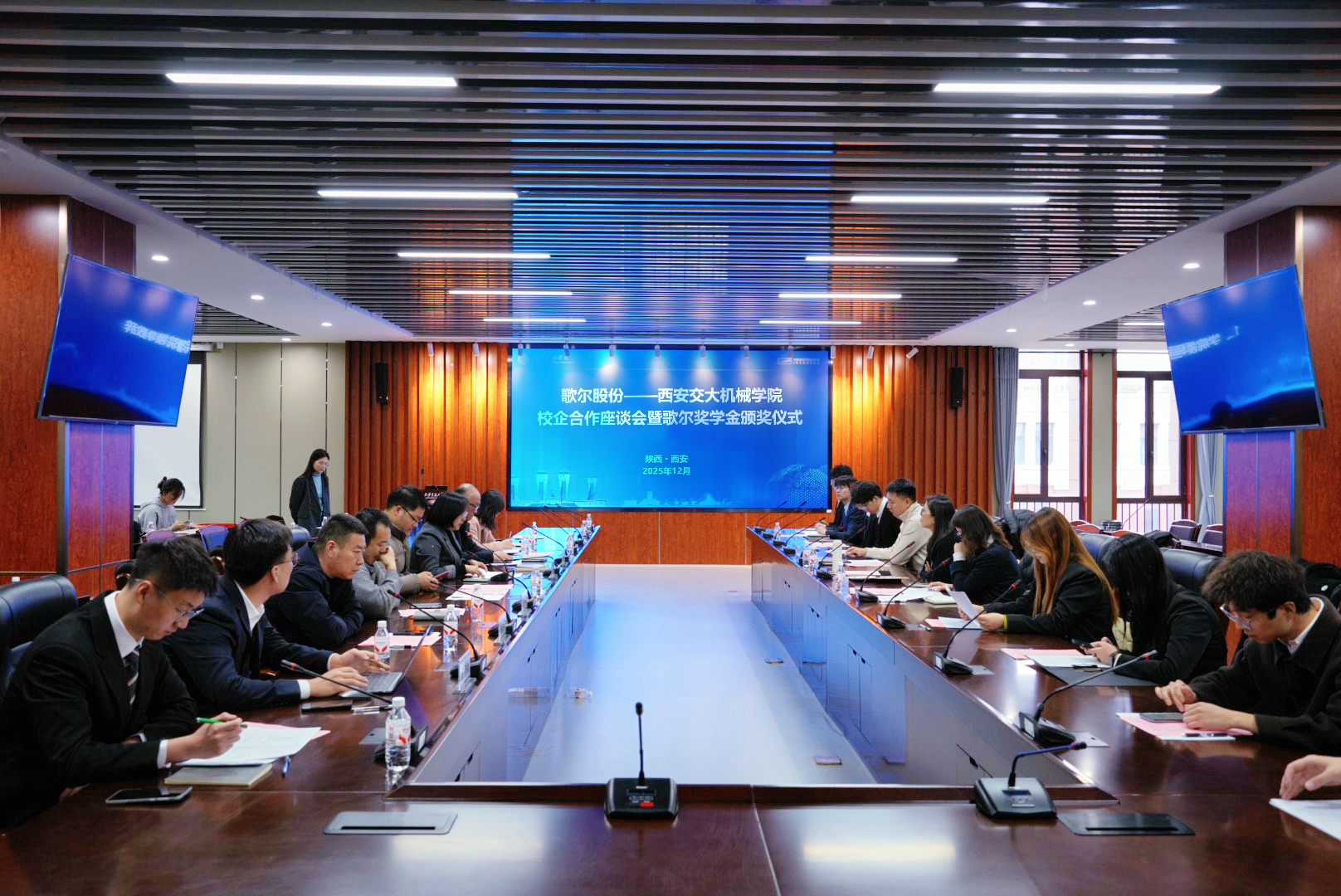 2025年12月2日下午,歌尔股份有限公司与西安交通大学机械工程学院校企合作座谈会暨“歌尔奖学金”颁奖仪式在创新港力行楼顺利举行。双方围绕人才培养、科研合作与卓越工程师教育等议题展开深入交流,共同探讨产教融合新路径,并为本年度获得歌尔奖学金”的学生颁发荣誉。
