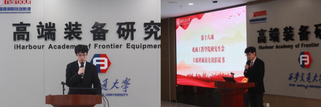 校研究生会主席团成员候选人熊峰致辞,他首先肯定了校院两级研会过去一年在思想引领、服务同学等工作中取得的成绩,特别是校研会当选全国学联第二十八届主席团团体单位,机械学院研会组织建设与服务质量突出。同时对机械研会的下一步工作提出了建议与期待。能源与动力工程学院研究生会主席团成员邓淼俐交流发言,她表示,能动学院与机械学院同源而出,相向而行,在学科建设、学院建设与学生工作等方面密切合作,培养了浓厚的兄弟情谊。在新时代的发展浪潮中,两院将继续携手共进,共同推进学校工科建设发展,为祖国的发展建设添砖加瓦。